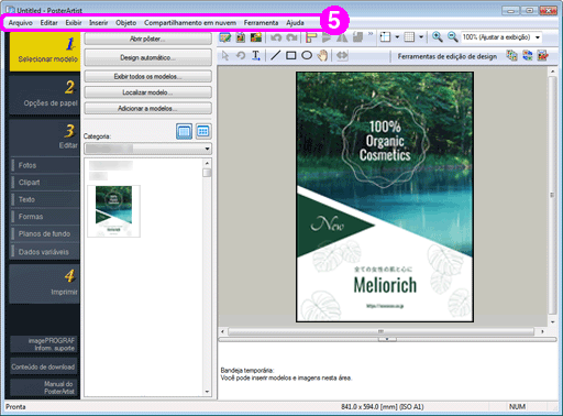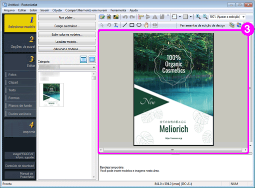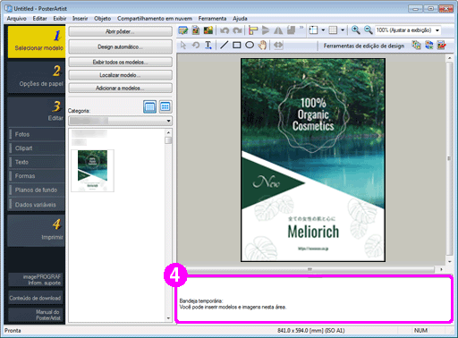 Coloque as fotos que você não tem certeza se usará ou fotos frequentemente usadas na bandeja temporária. Modelos e fotos na bandeja temporária podem ser adicionados aos pôsteres quando necessário, sem pesquisar nas miniaturas novamente.