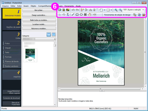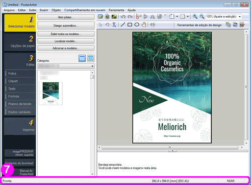 Mostra o tamanho do papel para o pôster exibido na área de design do pôster.