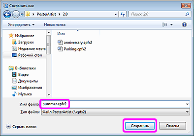 Диалоговое окно Сохранить как закрывается, созданный плакат сохраняется как файл для использования в программе PosterArtist с расширением «.cpfx2».