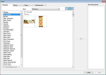 - Wechseln Sie zwischen den Registerkarten Vorlagen (Templates), Fotos (Photos), Cliparts (Clipart) und Hintergründe (Backgrounds).