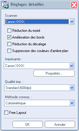 Affiche la boîte de dialogue Réglages détaillés permettant de modifier le scanner et l'imprimante à utiliser et de définir des paramètres avancés pour la numérisation.