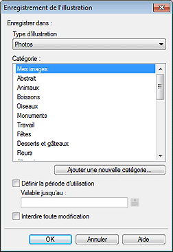 Vous pouvez empêcher que l'image ne soit modifiée ou définir une durée d'utilisation limite. Pour plus d'informations, reportez-vous à la section Boîte de dialogue Enregistrement de l'illustration (Images).