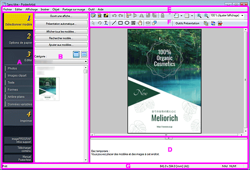 Il s'agit de l'écran principal de PosterArtist. Utilisez les différentes fonctions de chaque zone pour modifier vos affiches, les imprimer, etc.