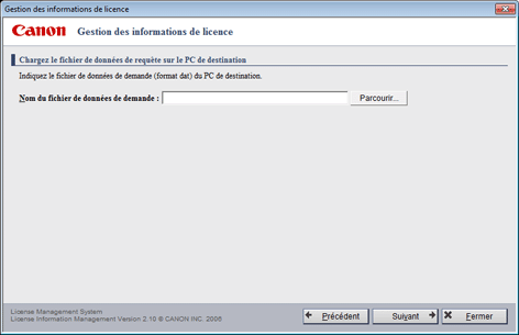 Spécifiez le fichier de demande de licence sur l'ordinateur de destination, puis cliquez sur Suivant.