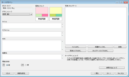 [テンプレート選択]画面で[オートデザイン...]をクリックすると表示されます。ポスターの完成まで、画面が3回変わります。