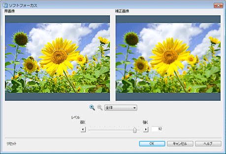 (画像補正)をクリックすると、[画像編集]ダイアログボックスが表示されます。[ソフトフォーカス]をクリックすると、[ソフトフォーカス]ダイアログボックスが表示されます。