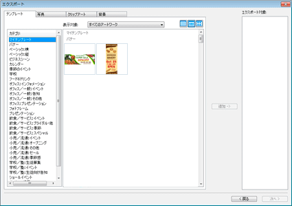 - [テンプレート]、[写真]、[クリップアート]、[背景]のライブラリをタブで切り替えます。