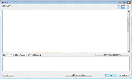 - 選んだデザインを仮置きトレイに追加します。仮置きトレイに置いておくと、デザインアシストを終了後もいつでもデザインを変更できます。複数のデザインを仮置きトレイに追加することができます。