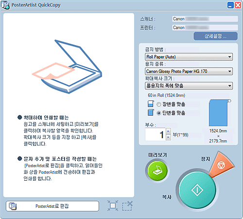 - PosterArtist QuickCopy에 대한 자세한 내용은 PosterArtist QuickCopy 화면을 참조하십시오.
