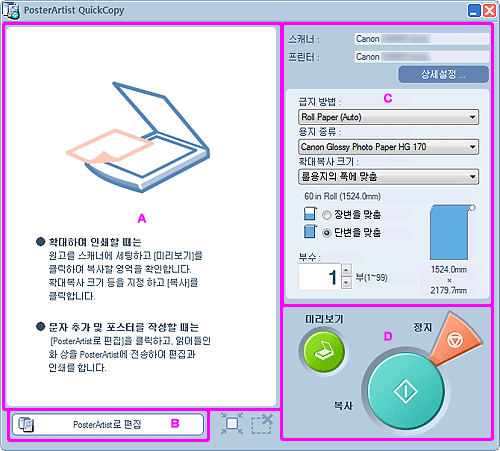 사용할 스캐너 및 프린터를 선택하고 인쇄 방법을 지정하는 등 조작을 수행할 수 있는 PosterArtist QuickCopy의 메인 화면입니다.