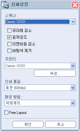 상세설정(Detailed settings) 대화 상자를 표시하여 사용할 스캐너 및 프린터를 변경하고 스캔 고급 설정을 수행합니다.