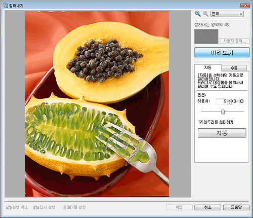 - 잘라내지 않은 원본 이미지가 미리 보기에 표시될 때 잘라낸 영역에 채울 색을 지정합니다. 색상은 사용자 정의...(Custom...)를 클릭하여 표시되는 색(Color) 대화 상자에서 변경할 수 있습니다.