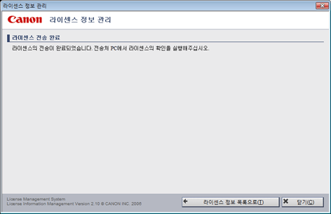 라이센스 정보 관리(License Information Management) 화면에서 전송(Transfer)을 클릭합니다.
