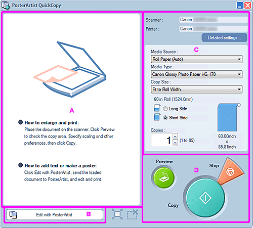 Essa é a tela principal do PosterArtist QuickCopy para selecionar o scanner e a impressora a serem usados, especificando o método de impressão e muito mais.