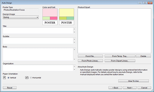 Чтобы открыть этот экран, нажмите Автоматический дизайн... (Auto Design...) на экране Выбрать шаблон (Select Template). В процессе создания плаката экран переключается три раза.