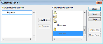 Добавление кнопки или разделителя, выбранного в списке Доступные кнопки панели инструментов.