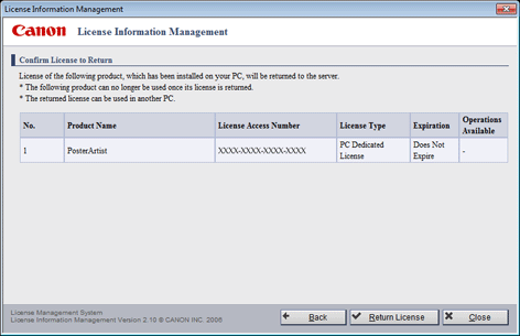 Просмотрите появившееся сообщение и выберите Возврат лицензии (Return License).
