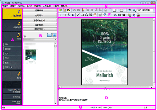 这是PosterArtist的主屏幕。 使用每个区域中的各种功能来编辑、打印海报等。