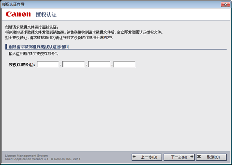 在授权认证向导屏幕中,选择离线认证和创建请求数据复选框,然后单击下一步。