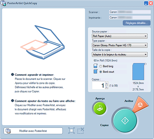 - Pour en savoir plus sur PosterArtist QuickCopy, reportez-vous à la section écran PosterArtist QuickCopy.