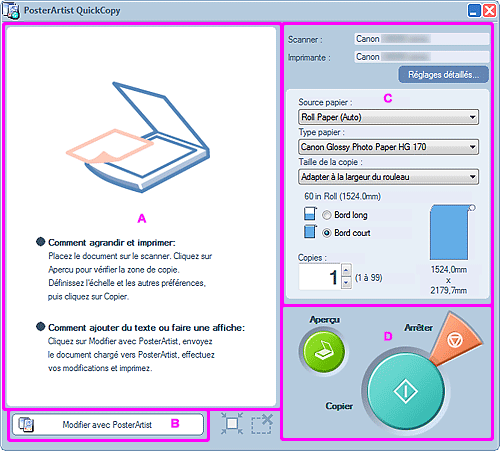 Il s'agit de l'écran principal de PosterArtist QuickCopy pour sélectionner le scanner et l'imprimante à utiliser, spécifier la méthode d'impression, etc.