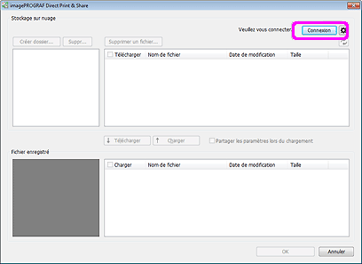 - Pour utiliser cette fonction imagePROGRAF Direct Print & Share, (ci-après "Direct Print & Share") version V2.0.0 ou ultérieure doit être installé. Pour connaître la procédure opérationnelle de Direct Print & Share et les services sur le nuage pris en charge, reportez-vous à l'aide de Direct Print & Share.