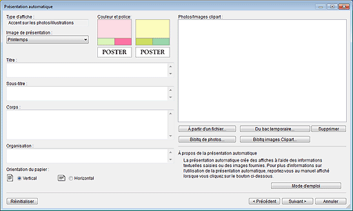 Pour afficher l'écran, cliquez sur Présentation automatique... sur l'écran Sélectionner modèle. L'écran change trois fois à mesure que vous poursuivez le processus de création de l'affiche.