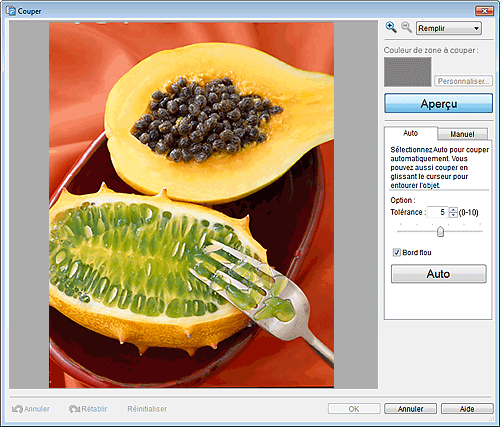 - Spécifiez la couleur de remplissage de la zone à découper lorsque l'image originale, qui n'a pas été découpée, est affichée dans l'aperçu. La couleur peut être modifiée dans la boîte de dialogue Couleur qui s'affiche en cliquant sur Personnaliser....