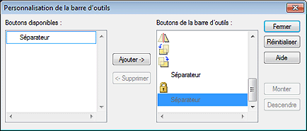 Ajoute le bouton ou Séparateur sélectionné sous Boutons de barre d'outils disponibles.