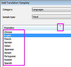 Nota- La finestra di dialogo Aggiungi modello di traduzione (Add Translation Template) può essere visualizzata anche facendo clic con il pulsante destro del mouse su una casella di testo sul poster, quindi selezionando Aggiungi modello di traduzione (Add Translation Template).