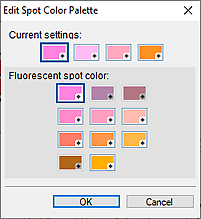 Selezionare il colore che si desidera modificare nella tavolozza in Impostazioni attuali (Current settings), quindi selezionare il colore che si desidera visualizzare nella tavolozza in Colore spot fluorescente (Fluorescent spot color).