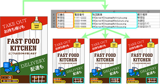 表形式のデータを使用して、ポスター内の文字列や画像などを自動的に置き換えて同じポスターを印刷することができます。