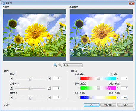 (画像補正)をクリックすると、[画像編集]ダイアログボックスが表示されます。[色補正]をクリックすると、[色補正]ダイアログボックスが表示されます。