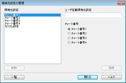 [ツール]メニューから[環境光設定の管理...]をクリックすると、[環境光設定の管理]ダイアログボックスが表示されます。