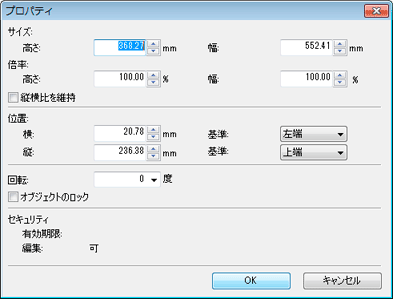 ポスター上の設定したいオブジェクトを選び、[オブジェクト]メニューの[プロパティ...]をクリックすると、[プロパティ]ダイアログボックスが表示されます。