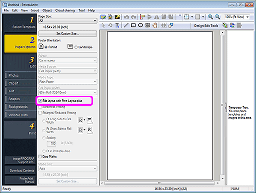 - 이 기능을 사용하는 경우, PosterArtist에서 출력 용지를 구성할 수 없습니다. Free Layout plus에서 용지 크기를 지정하십시오.