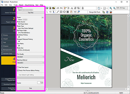 참고- 용지 옵션(Paper Options) 화면에서 Free Layout plus로 레이아웃 편집(Edit layout with Free Layout plus) 확인란을 선택하면 인쇄 버튼 대신 인쇄(Free Layout plus 시작)(Print (Start Free Layout plus))가 표시되며 해당 버튼을 클릭하면 Free Layout plus를 시작합니다. Free Layout plus에 대한 자세한 내용은 사용하는 모델의 온라인 설명서를 참조하십시오.