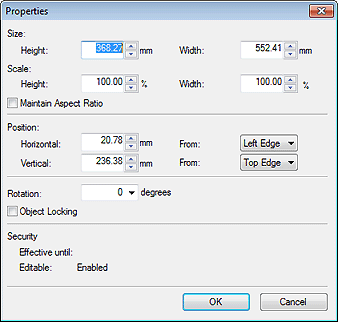 Para exibir a caixa de diálogo Propriedades (Properties), selecione o objeto de destino no pôster e clique em Propriedades... (Properties...) no menu Objeto (Object).