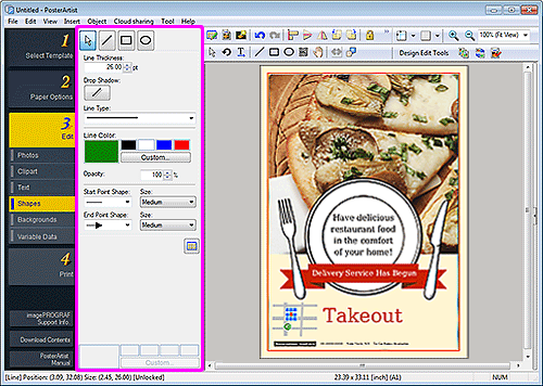 Adicione linhas retas, círculos, retângulos, setas e outras formas aos pôsteres.