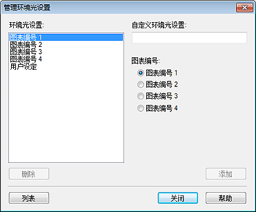 注释- 还可以使用新名称保存默认环境光设置。 在这种情况下,在图表编号中,从图表编号 1到图表编号 4进行选择。