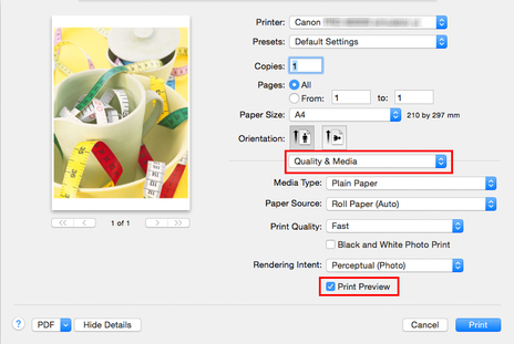 Fare clic sulla finestra di dialogo Antepr. di stampa (Print Preview) nel pannello Qualità/Tipo di carta (Quality & Media) della finestra di dialogo Stampa (Print).