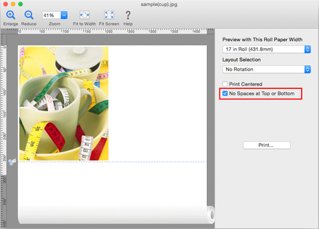 Nel pannello di controllo e modifica delle impostazioni di stampa, selezionare Carta in rotoli in Anteprima con questa Larghezza carta in rotoli (Preview with This Roll Paper Width).