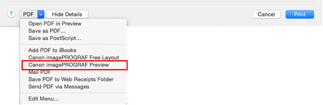 A partir do menu pop-up PDF, selecione Canon imagePROGRAF Preview.
