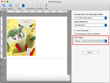Os perfis ICC disponíveis em seu sistema operacional são exibidos em Alteração de Configuração de impressão e Painel de controle. A impressora está solicitando o perfil selecionado.