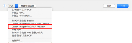 在打印对话框中单击PDF弹出菜单,并从列表中选择Canon imagePROGRAF Preview。