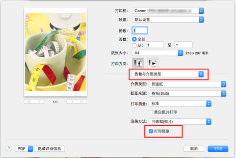 单击打印对话框中质量与介质类型面板上的打印预览复选框。