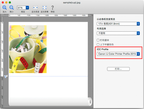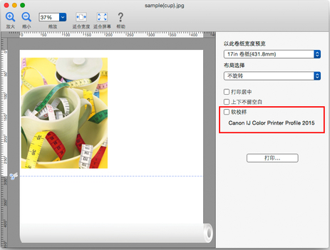 选中软校样后,将按照在打印机驱动程序中设置的打印机配置文件显示预览。