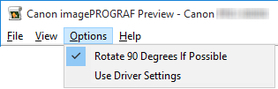 É possível selecionar Girar 90 graus se possível (Rotate 90 Degrees If Possible) ou Usar configurações do driver (Use Driver Settings) no menu Opções (Options).