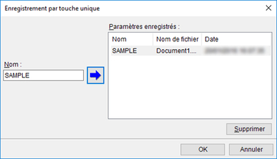 Pour imprimer de manière répétitive avec les mêmes paramètres, vous pouvez sélectionner Enregistrement par touche unique. Il est possible de rappeler les paramètres enregistrés depuis Imprimer à l'aide des paramètres enregistrés.