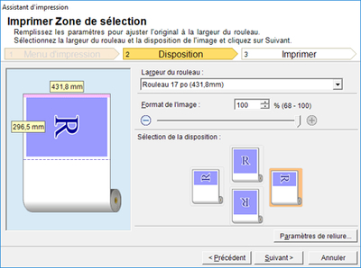 Configurez les paramètres jusqu'à Sélection de la disposition dans l'écran Disposition d'Imprimer Feuille entier ou Imprimer Zone de sélection.